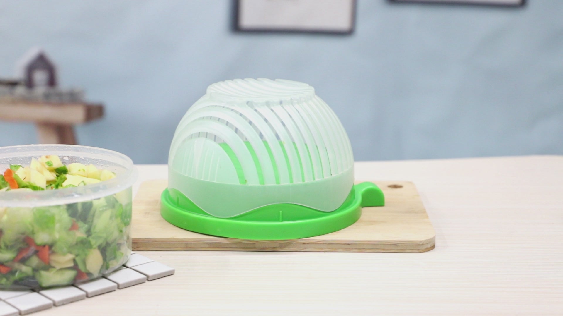 Our salad cutter bowl has a completely new design that makes it easier to accurately rotate the top cover by 90°and secure it to the base.